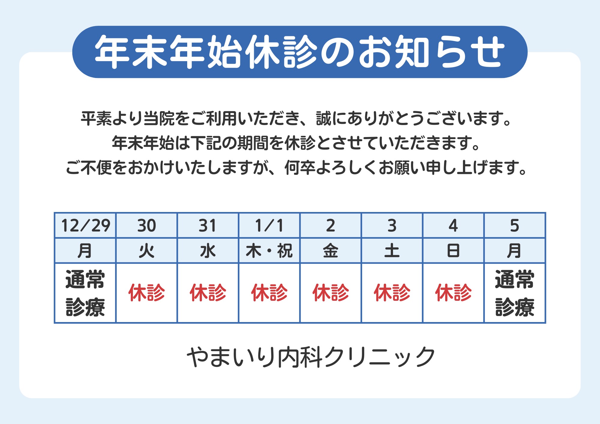 誠に勝手ながら12月30日〜1月4日まで休診とさせていただきます。